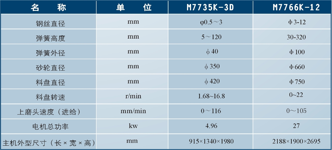 该机床为立式弹簧磨床,用于干式磨削压缩弹簧,可以实现渐近式磨削和压入式磨削。通过触摸屏实现人机对话,操作简单。可存入多组磨簧参数,方便磨簧工人调用、编辑及修改。工作其间,屏幕自动跟踪显示各阶段状态。允许不退出磨削程序修改参数。